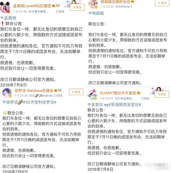 通过以上事件,让我想到了现实生活中的一些危机公关事件,比如:前段时间事件发生的火箭少女101十一位成员各自的后援会几乎在同一时间发布微博称:官方通过不可抗力原定于7月11日的成团发布会,无法如期举行,而孟美岐,吴宣仪,紫宁也相继宣布退出101女团事件,引发大众热议。