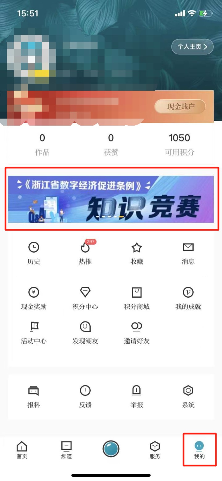 第2步:打开天目新闻,点击“我的”-“浙江省数字经济促进条例知识竞赛”活动,参与活动;或点击“我的”-“活动中心”-“浙江省数字经济促进条例知识竞赛”参与活动。