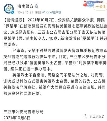 10月8日,三亚公安机关依法传唤了罗某平,并以涉嫌“侵害英雄烈士名誉、荣誉罪”对其采取刑事拘留措施。