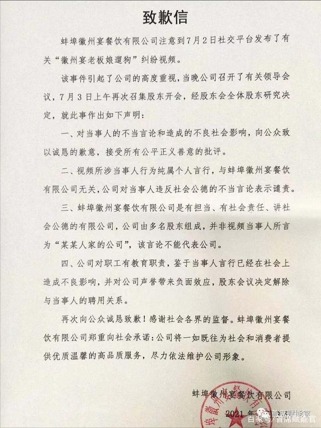 第二天,徽州宴发布“致歉信”,表示当事人邹某的言行为个人行为与公司无关,宣布解除与邹某的聘用合同。