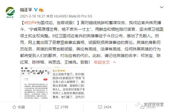 此前的2月份,中印边境斗争中我人民解放军战士英勇战斗的细节首次披露,英雄团长祁发宝身负重伤,营长陈红军、战士陈祥榕、肖思远、王焯冉英勇牺牲,英雄们的事迹感动了无数国人。然而,网络上竟然出现了网名显示“辣笔小球”的恶意歪曲事实真相、诋毁贬损英雄事迹的言论。