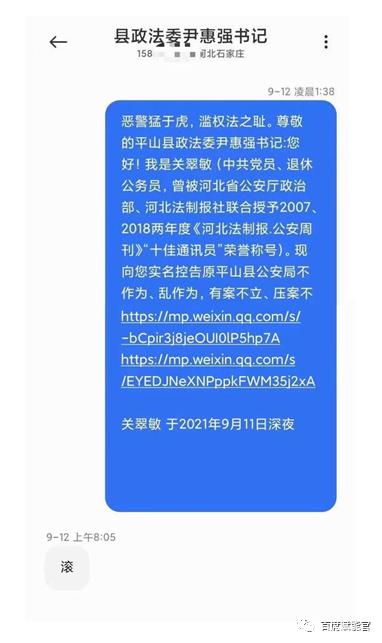 2021年9月12日凌晨1时许,市民关某某给河北平山县委政法委书记尹某强发出了一条反映当地公安部门不作为等问题的短信。早上8时许,尹某强回复该短信一个字:“滚”。