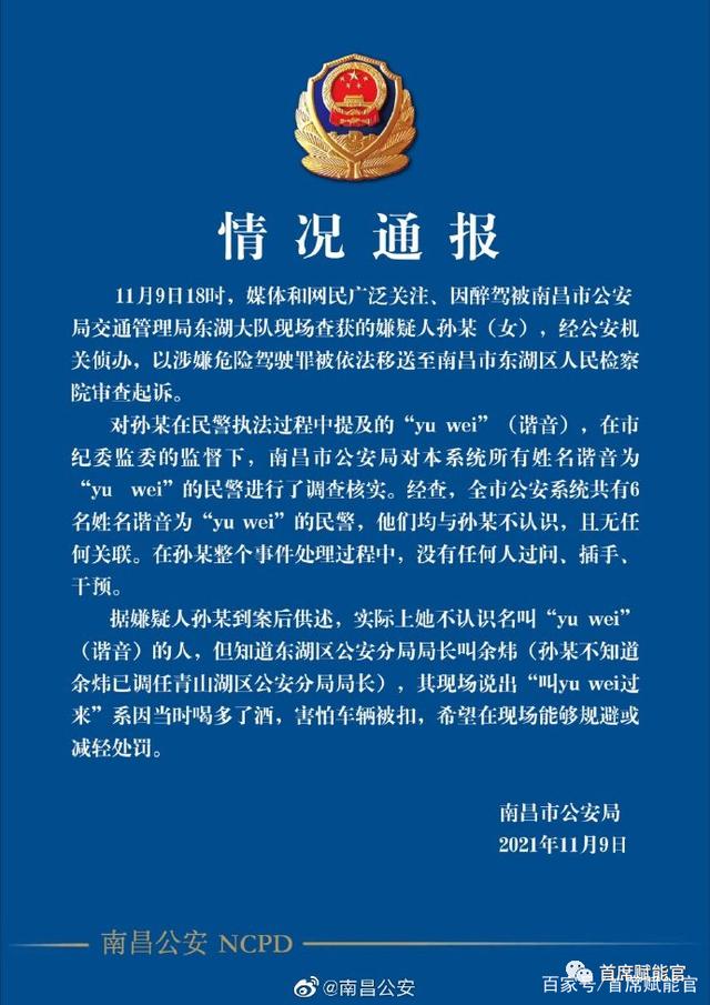 11月9日晚,南昌市公安局通报,孙某以涉嫌危险驾驶罪被移送至南昌市东湖区人民检察院审查起诉。经调查核实,全市公安系统共有6名姓名谐音“yu wei”的民警,均与孙某不相识且没有关联。据孙某供述,其本人因醉驾后害怕车辆被扣,在知道东湖区公安分局局长余炜(孙某不知道余炜已调任青山湖区公安分局局长)姓名的情况下,说出“叫yu wei过来”,希望现场能规避或减轻处罚。整个事件过程中,没有任何人过问、插手、干预。