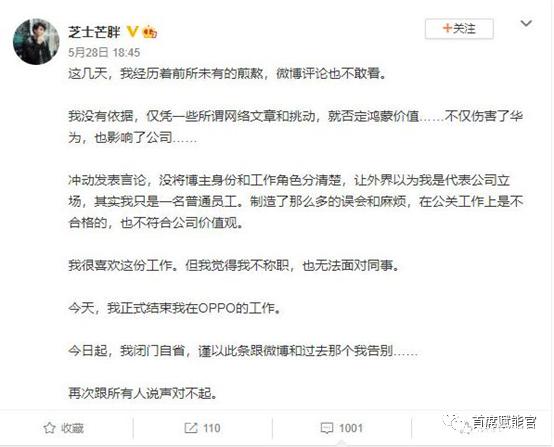 第二天,黄某涛发微博道歉,称其言论仅代表自己,不涉及就职公司。5月28日,黄某涛发微博称觉得“不称职”、“结束在OPPO的工作”。