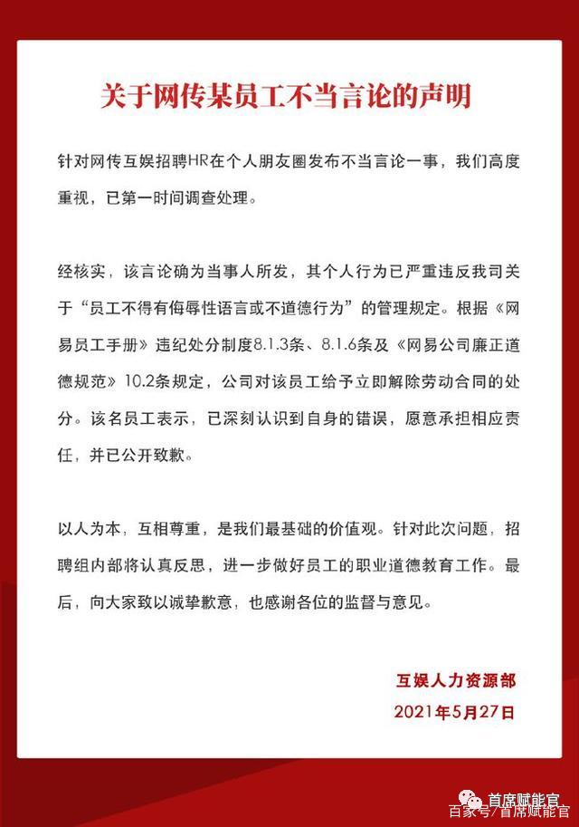 当天晚间,涉事公司发布声明称,经调查后确认不当言论为当事人所发,其个人行为严重违反公司“关于员工不得有侮辱性词语或不道德行为”的管理规定,决定对当事HR立即解除劳动合同。
