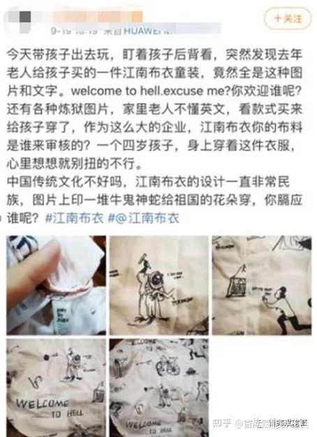 【事件梗概】2021年9月19日,一位网友在社交网站上发文称家里的一件“江南布衣”品牌童装上印满了“Welcome to hell(欢迎来到地狱)”、“let me touch you(让我摸摸你)”、“I just need a foot(我只要一只脚)”等字样,以及一些如砍断腿、炼狱的图案,引起了部分网友的关注和讨论。一些网友翻出自己之前购买的该品牌童装,发现上面也有此类图案与英文。讨论中,有网友指出该品牌此前部分广告海报风格阴森恐怖、含有暴力色情等元素。