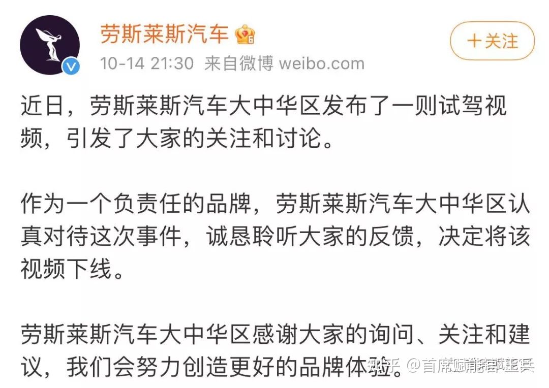 【同类案例】2021年9月24日,劳斯莱斯官方账号发了一段营销视频,视频主角是网红晚晚林涵夫妻。发布该视频所配的文案是:“劳斯莱斯库里南西域寻臻,纵行天山之南,展现出这款奢华汽车的冒险精神,尽享“无处不从容”的人生巅峰。”内容发出后,遭到部分网友的反感,认为这是拉低用户的档次,更有网友不断起底这视频主角晚晚林涵夫妻的“黑料”。10月11日,王思聪作为车主,在评论区称“以后不会买了”,舆论进一步发酵。10月14日劳斯莱斯下架视频并发布声明,表示会认真对待此次事件,诚恳聆听大家的反馈,“决定将该视频下架。”