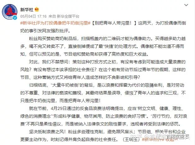 5月4日 新华社发表评论【别把青年人带沟里!】指出,“大量牛奶被倒”的背后,是以浪费和挥霍为代价的吸睛牟利,是对劳动的不尊重、对法律的亵渎和蔑视,是误导、侵蚀了青年人的追求和三观,不只是把牛奶倒沟里,而是把青年人带沟里!当天,北京市广电局,责令平台方暂停对《青春有你》第三季的录制,要求该平台严格落实广电行政部门有关规定,完善节目管理制度,认真核查并整改存在的问题。次日凌晨,《青春有你》制作组在官方账号上做出回应,表示对惩罚坚决服从,诚恳接受,认真核查并整改问题,力求更加严格细致地把握节目制作的每个环节,积极营造健康的网络环境,感谢社会各界的关心和督导,对出现的问题深表歉意。