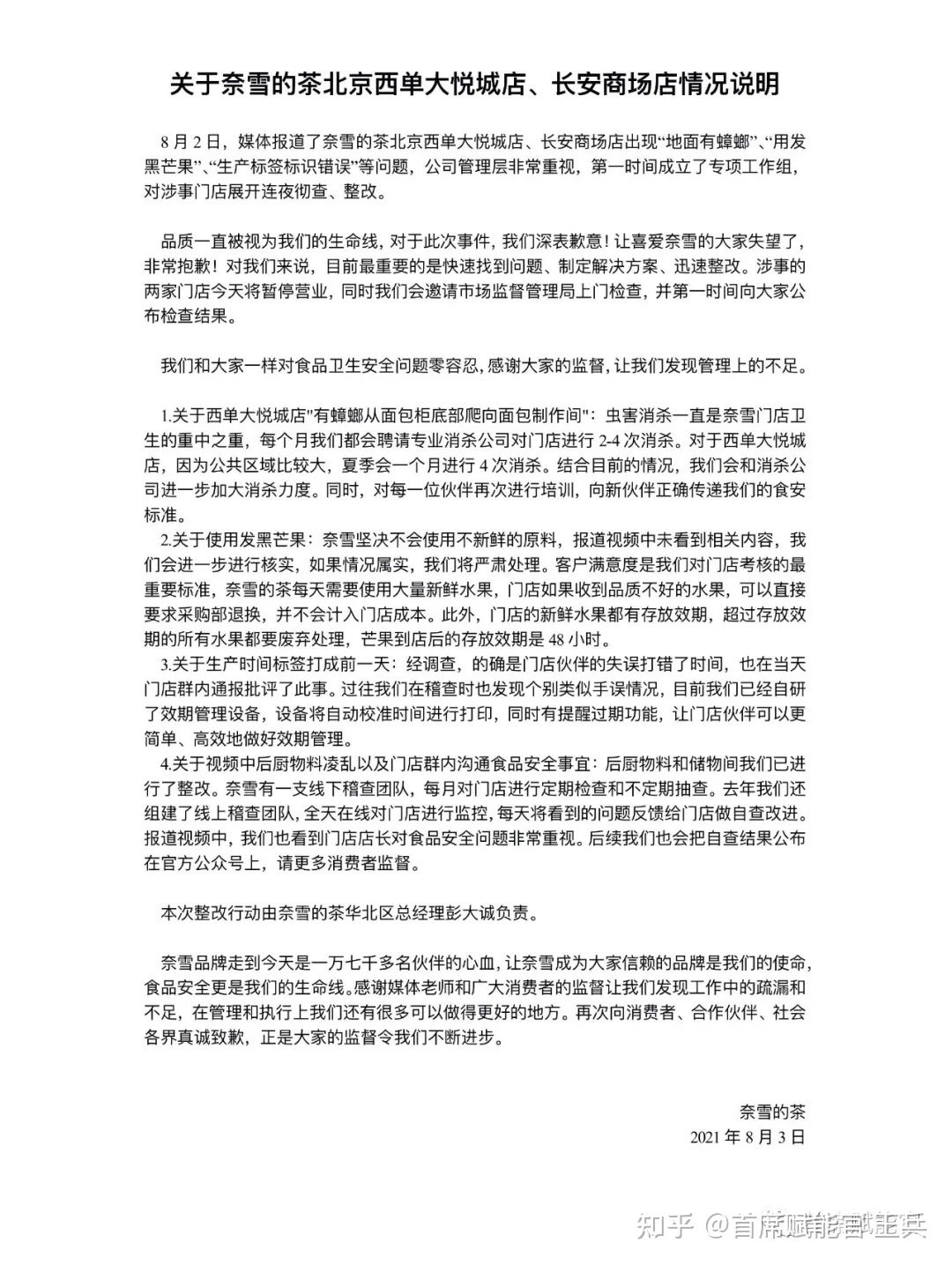 2021年8月2日晚,新华社发布报道《记者卧底奈雪的茶打工:蟑螂不用管、标签随意换》称,记者通过随机应聘“卧底”网红奶茶店奈雪的茶,发现其多家分店存在蟑螂乱爬、水果腐烂、抹布不洗、标签不实等问题。8月3日凌晨,@奈雪的茶Nayuki发布情况说明称:8月2日,媒体报道了奈雪的茶北京西单大悦城店、长安商场店出现“地面有蟑螂”、“用发黑芒果”、“生产标签标识错误”等问题,公司管理层非常重视,第一时间成立了专项工作组,对涉事门店展开连夜彻查、整改。涉事的两家门店今天将暂停营业,同时会邀请市场监督管理局上门检查,并第一时间公布检查结果。”还在微博评论区贴出涉事门店的消杀报告以及新鲜水果存放效期标准。