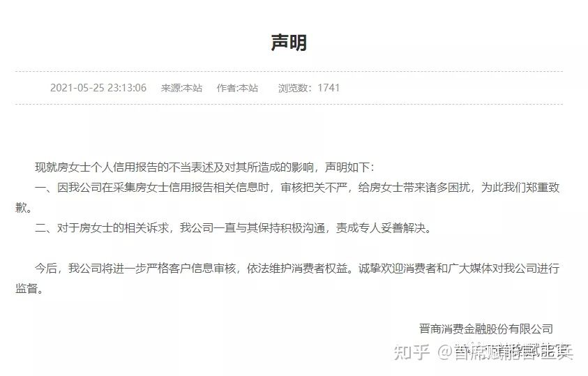 据媒体报道,2018年4月,房女士在位于南通中南大厦的晋商消费金融股份有限公司分支机构签署了一份162000元的个人消费贷款合同,贷款期限约定36个月,当月下款时就被不明不白扣掉了11340元。房女士从2018年5月持续按约还款,直到2020年1月,21个月内累计还款124902.12元。新冠疫情发生后,晋商消费金融公司针对受疫情影响暂无法按期还款的客户推出一些优惠服务,房女士也申请了贷款展期。征信报告显示,这项贷款在2020年2-12月没有还款的计划安排。进入2021年,房女士没有恢复还款,因为“对当初下款被扣的1万多元持有异议,又一直没有得到合理的解释”。事件发生后,人民银行太原中心支行于4月8日、5月25日,先后两次约谈晋商消费金融公司,出具监管意见、严肃提出后续整改要求。5月25日深夜,晋商消金官网发布声明,就房女士个人信用报告中的不当表述及对其所造成的影响致歉;同时,晋商消金表示欢迎消费者和广大媒体对该公司进行监督。