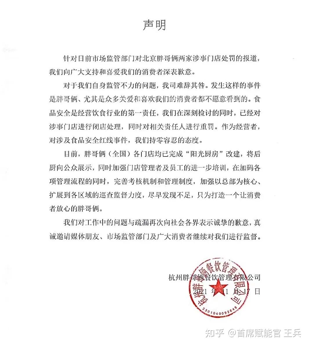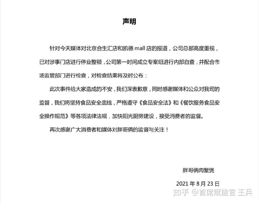 【同类案例】2021年8月23日,同为网红餐饮品牌的胖哥俩被爆出食品安全问题。据媒体暗访调查发现,胖哥俩标榜现宰现杀的螃蟹,却是前一天没卖完的螃蟹冷藏后第二天继续卖,清洗后的隔夜螃蟹便可以充当新鲜螃蟹重新送上顾客的餐桌;包装袋上标识即将过期的土豆,店员在拆封包装后继续被当作可以使用的食材。当天,胖哥俩官微发声明对此进行回应,称已对涉事门店进行停业整顿,公司第一时间成立专案组进行内部自查,并配合市场监管部门进行检查,对检查结果将及时公布。