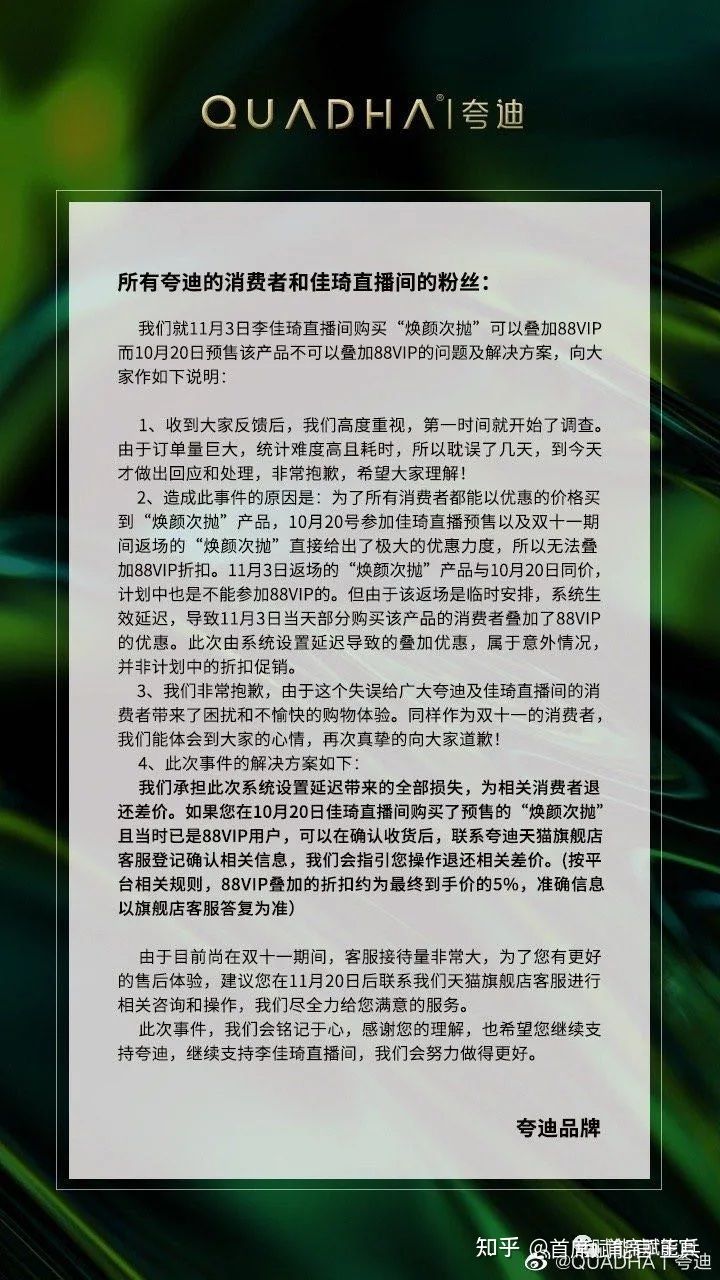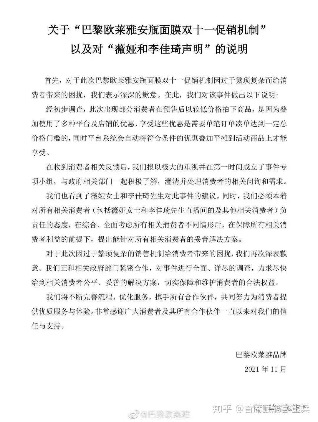 11月18日凌晨2:15,巴黎欧莱雅发布“关于‘巴黎欧莱雅安瓶面膜双十一促销机制’以及对‘薇娅和李佳琦声明’的说明”。表示消费者之所以在直播间拿到最低价,是因为叠加了平台和店铺999减200的优惠券,想要享受这些优惠,需要达到一定的消费门槛。在收到消费者相关反馈后,已成立事件小组,目前正和相关政府部门紧密合作,力求尽快给到相关消费者公平、妥善的解决方案。