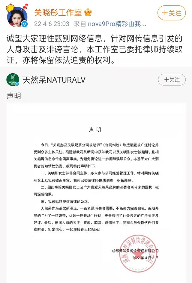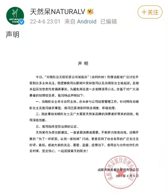 随即,成都天然呆餐饮管理有限公司于昨夜23:01发布声明,企图撇清关晓彤与天然呆的关系。