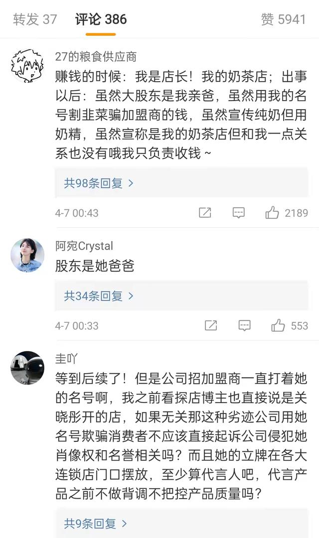 按理说,一家公司与其加盟商发生合同纠纷问题,公众的不满情绪应该集中在品牌和公司总部上,而非集火于代言人。究其原因,关晓彤的工作室必须要承担一定的责任。