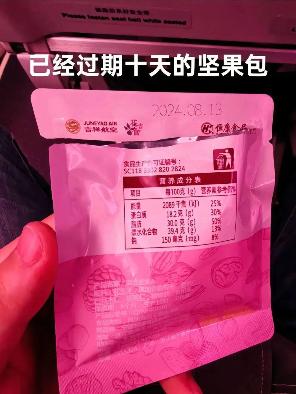 据乘客提供的信息,坚果零食包装上标注的生产日期为2024年8月13日,保质期为6个月。然而,在航班上发放时,该零食包已经超过保质期10天。