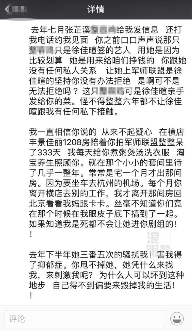 4、陈昱霖称前后被两个自称跟吴秀波有关系的女人"骚扰",其中一个是和吴秀波合作过《军师联盟》的演员张芷溪;