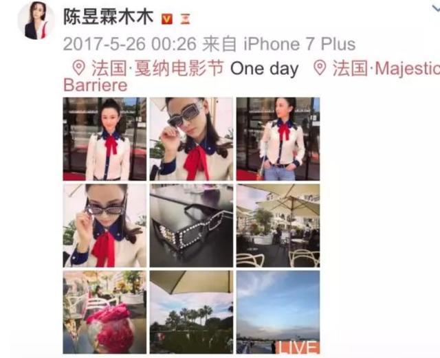 又比如说去年五月去米兰吴秀波动手打她的部分,但对照微博她去年5月份应该在参加法国戛纳电影节。直去年去年6月份陈昱霖才发了在米兰的微博,还是带定位的。