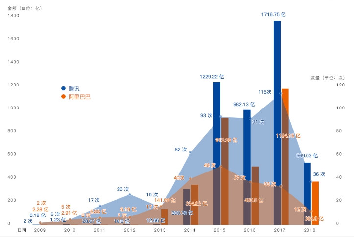 钛媒体在2017年末做了一个阿里腾讯投资数据表,并分析得出: