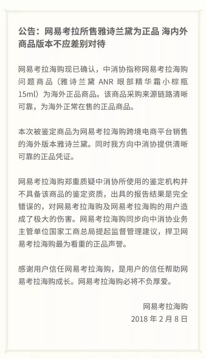 再比如今年的网易考拉,中消协发布的2017“双11”网络购物调查体验结果中,京东、聚美优品、网易考拉、蜜芽、拼多多等电商平台全部中枪,被调查出“海淘售假”。然而网易考拉率先进行了强势回应。发布了一条声明,指出所谓的“问题商品”均为海外正品且采购来源链路清晰可靠。并且“郑重质疑中消协所使用的鉴定机构不具备该商品的鉴定资质。”整个回应相对强势。这一事件最新的结果是,今年6月,网易考拉起诉中消协、雅诗兰黛等侵犯名誉权,要求赔偿2100万元,真是强势中的强势。