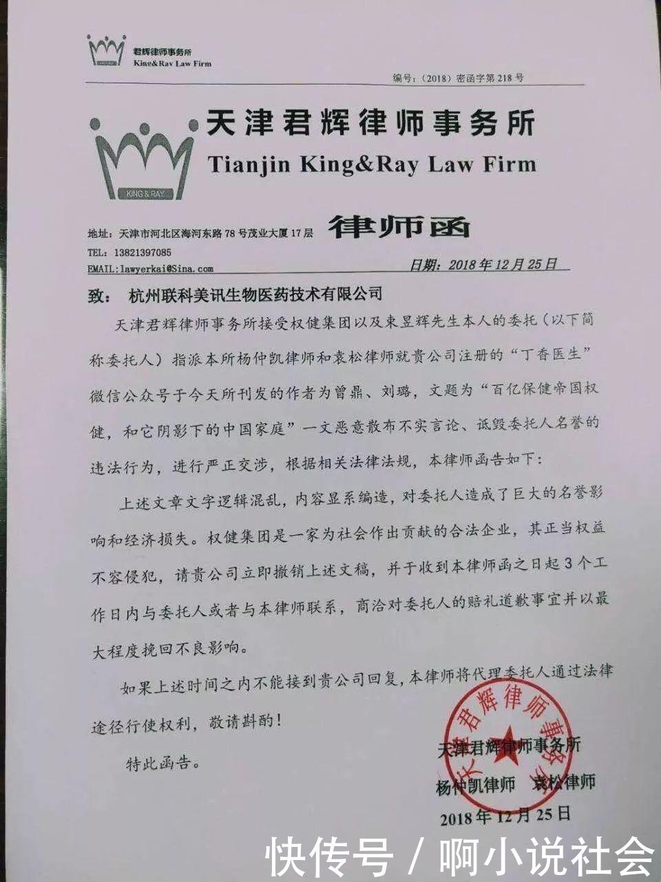 12月26日一早,丁香医生微博转发回应权健“声明”,表示“不会删稿,对每一个字负责,欢迎来告”。中午,新京报记者自丁香医生方面获悉,公司已经收到来自权健集团和权健创始人束昱辉的律师函。