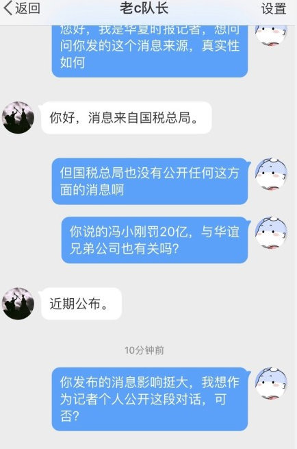11月19日,认证为“北京银泰安投资顾问有限公司董事长”的微博网友“老c队长”发微博称:“冯裤子被罚20亿,近期公布。可以转发500次。”