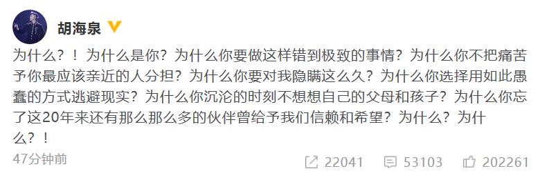 先看看他的两段发言,第一次说的是:“为什么?!为什么是你?为什么你要做这样错到极致的事情?为什么你不把痛苦予你最应该亲近的人分担?为什么你要对我隐瞒这么久?为什么你选择用如此愚蠢的方式逃避现实?为什么你沉沦的时刻不想想自己的父母和孩子?为什么你忘了这20年来还有那么那么多的伙伴曾给予我们信赖和希望?为什么?为什么?! ”