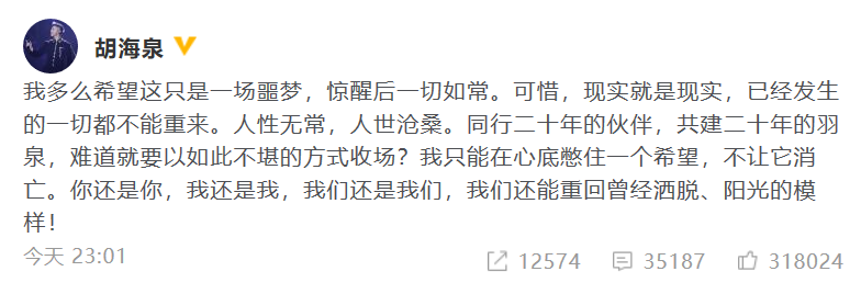 再次发声表示:“我多么希望这只是一场噩梦,惊醒后一切如常。可惜,现实就是现实,已经发生的一切都不能重来。人性无常,人世沧桑。同行二十年的伙伴,共建二十年的羽泉,难道就要以如此不堪的方式收场?我只能在心底憋住一个希望,不让它消亡。你还是你,我还是我,我们还是我们,我们还能重回曾经洒脱、阳光的模样! ”