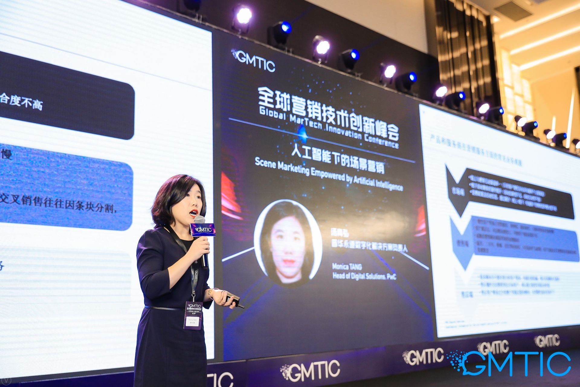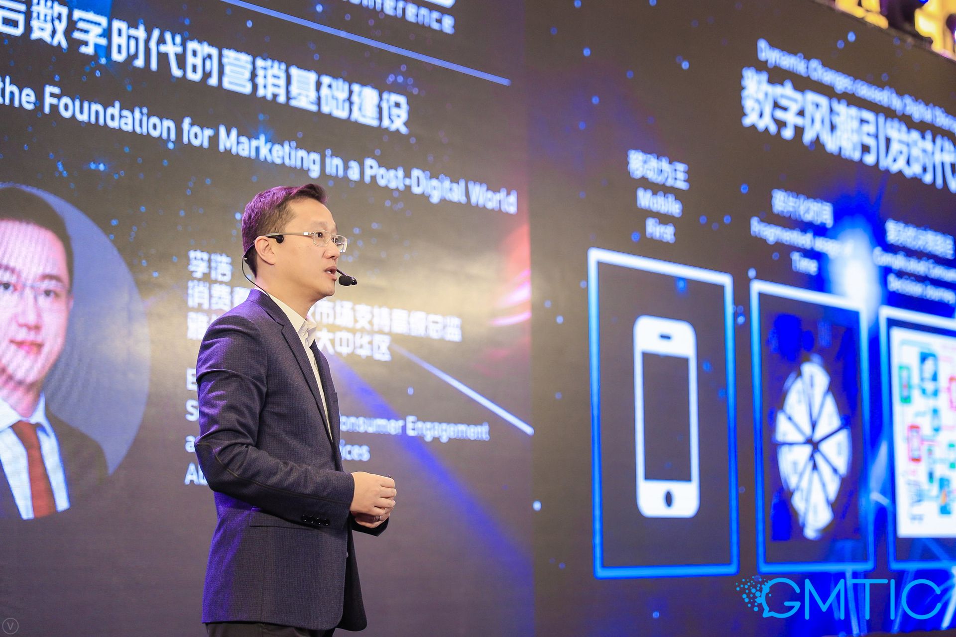 汤真弘作为普华永道数字化解决方案负责人在本届GMTIC带来了主题为“人工智能下场景营销”的主题演讲。演讲中,汤真弘介绍了当下的虚拟技术以及人脸识别和语音识别的发展。在品牌营销场景的分享部分,他说道“现在的消费者每天用在手机端的时间远远超过12小时,尤其是千禧一代,手机客户端可以做到时间和空间上拓展,为客户提供在线的支持和在线的问答。”