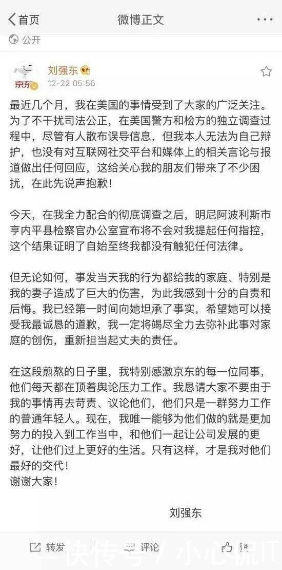 12月22日凌晨4点(美国时间15点),美国明尼苏达州明尼阿波利斯市亨内平县检察官办公室公布刘强东事件的调查结果,宣布刘强东性侵案结案,刘强东无罪,并决定不在予以起诉。被判无罪后,刘强东微博发文,向全世界发声,称很后悔,称该事件对京东普通员工造成了影响表示抱歉,并向章泽天道歉,一定会尽全力弥补对家庭造成的伤害!