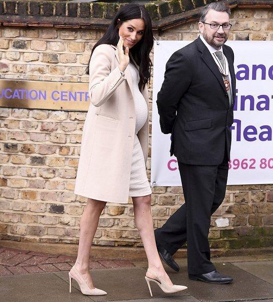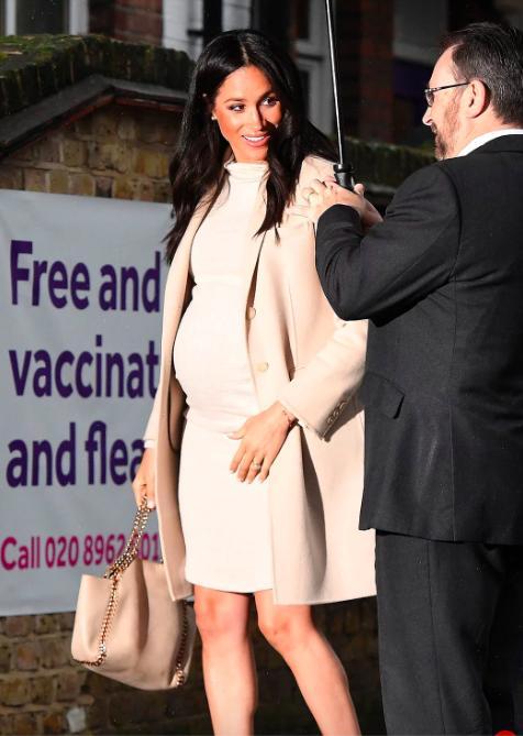 当天伦敦温度接近零度,还要漂着湿雨,而孕妇梅根在室外还待了蛮长时间,为了保证穿着看起来不累赘,她连丝袜也没穿,光着脚配搭的Paul Andrew高跟鞋还是夏天款的露踭凉鞋,勇气可嘉。