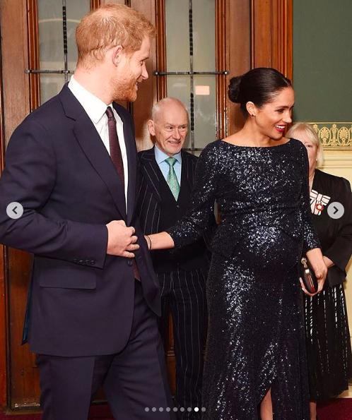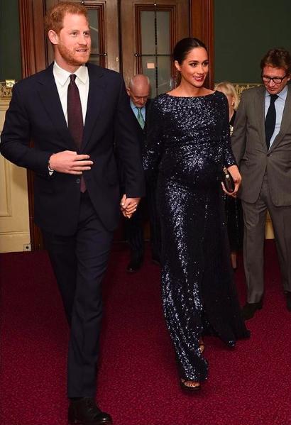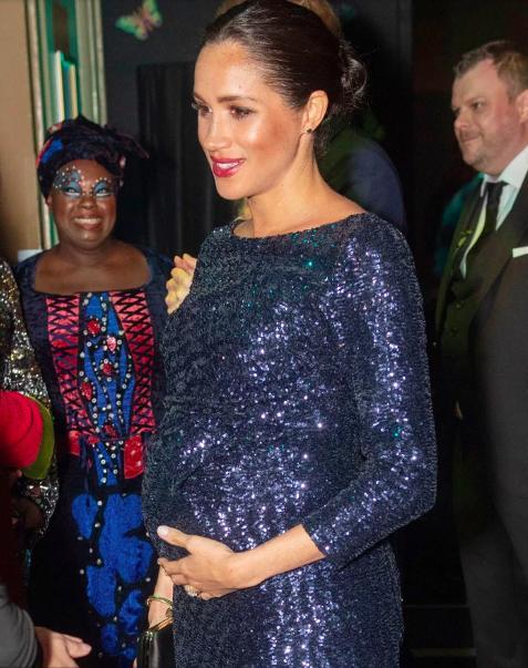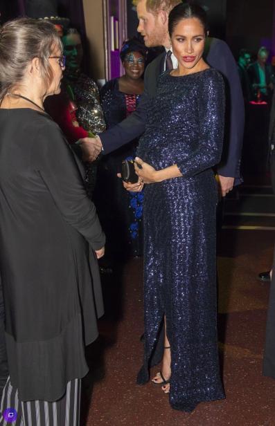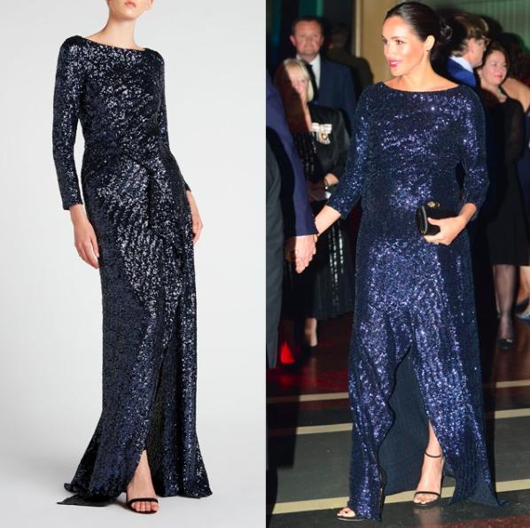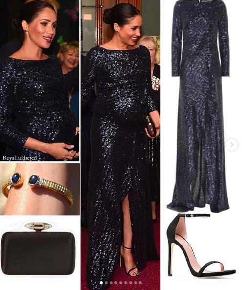 看官们可能对这件价值3495英镑(约3.5万人民币)的Roland Mouret设计的海军亮片礼服感觉很眼熟。因为它看起来与瑞典的维多利亚公主在2011年怀孕期间穿着的诺贝尔奖颁奖典礼晚礼服非常相似。只不过梅根的礼服有前开衩细节,看来这种设计完全为孕妇准备呀。