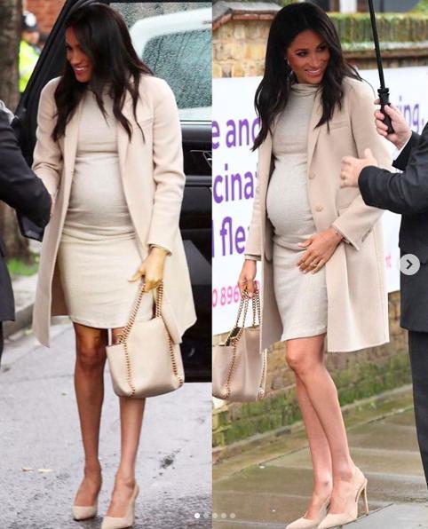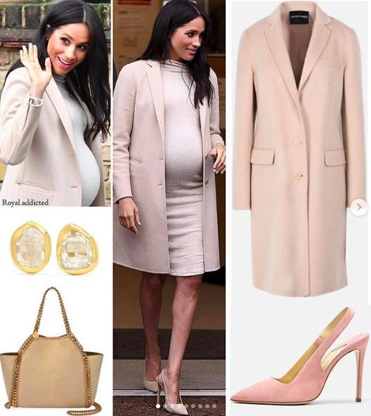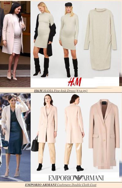 梅根着装上是为一直以来群众认为她花太多钱置装的一个反击,居然让人大跌眼镜地穿起来来自H&M产妇系列的24.99英镑高领连衣裙(大概250块钱人民币),而奶油色的外套来自阿玛尼,Stella McCartney的迷你双面手提包(1,145美元),耳环来自Pippa Small。