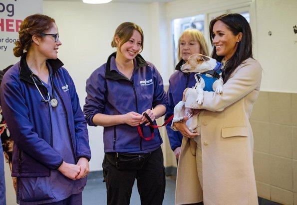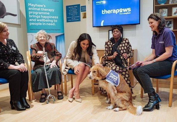 而在同一天的早些时候,梅根风格完全不同,她到位于伦敦西北部的动物福利慈善机构Mayhew访问,上周女王宣布看中梅根的工作能力,一下就派了四个工作给她,包括担任国家大剧院、大英国协大学协会、失业妇女机构smart work\动物权益机构mayhew的赞助人。