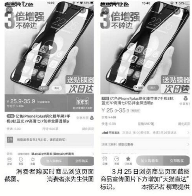 3月25日,长江商报记者再次登录张先生购买商品的浏览界面,发现手机钢化膜宣传页面左下角依然有“次日达”标示,而且多了“天猫直达”字样,而对比此前张先生发给记者的截图上可以看到,这个“天猫直达”的标识是没有的。
