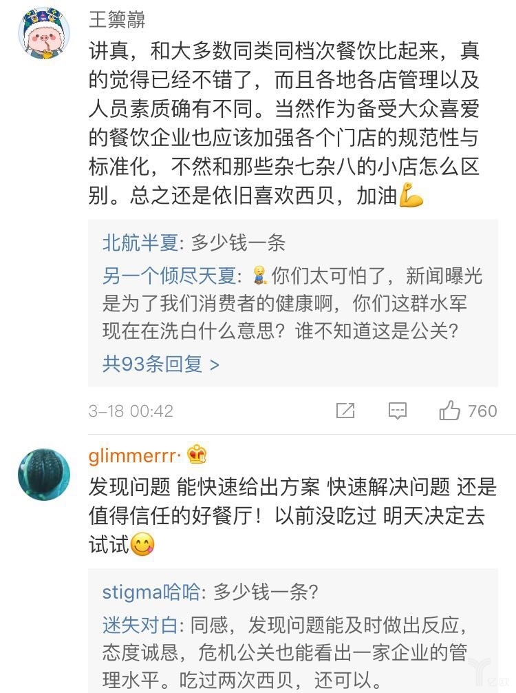 不能怪消费者不买账,近些年类似事件太多,出了问题,就道歉声明实在显得太过单薄。相比之下,西贝处理的方式显得更有诚意。事件曝光当天,西贝官方微博就在道歉声明中深刻反省,强调“干净卫生是餐饮的本分”,详细解释了对曝光出的问题采取的相应措施,开放厨房给公众参观。西贝副总裁也在个人微博中道歉。西贝被曝光的都是后厨操作不规范的问题,并没有外婆家那么严重。再加上西贝一直都采取“明厨亮灶”的形式,顾客口碑较好,公众舆论都表示支持,认为“西贝比起其他品牌后厨已经很干净了”。当然道歉声明下清一色的好评让人不禁怀疑其真实性,部分消费者似乎也因此对西贝好感下降。但由于西贝及时得体的危机公关,品牌在这次食安危机中并未受到太大损害。