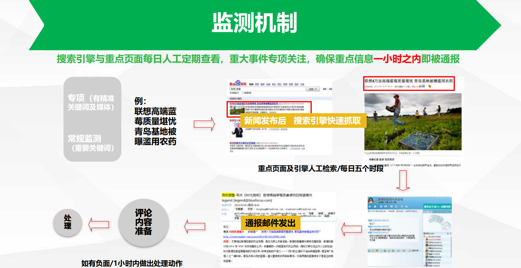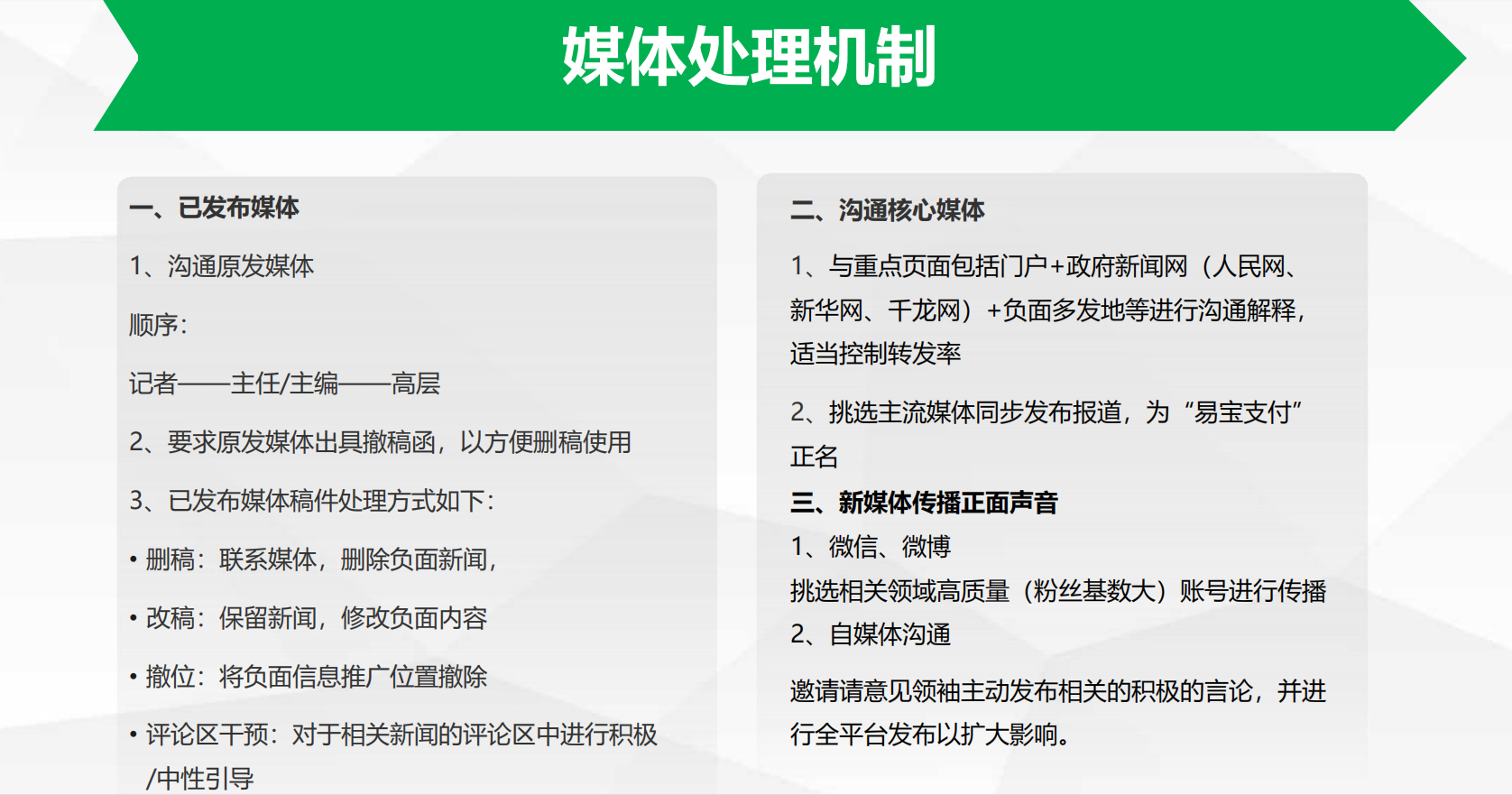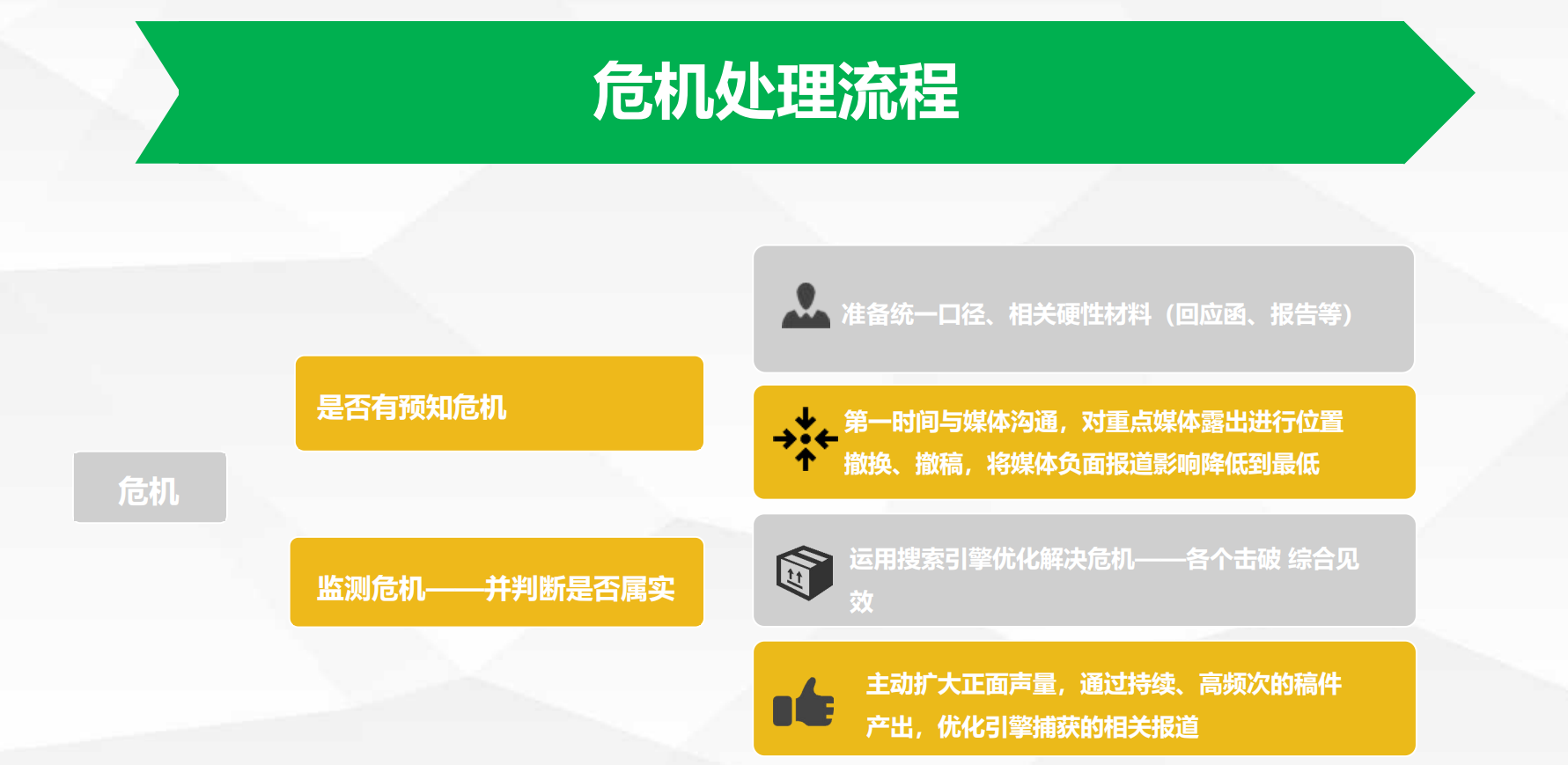 简单了说,企业做危机公关的时候,无非就这么几个点,负面爆发——收集负面——联系媒体——正面信息压制——负面信息删除等,本人之前又给一家公司做过相关的处理框架,分享出来和大家探讨下。