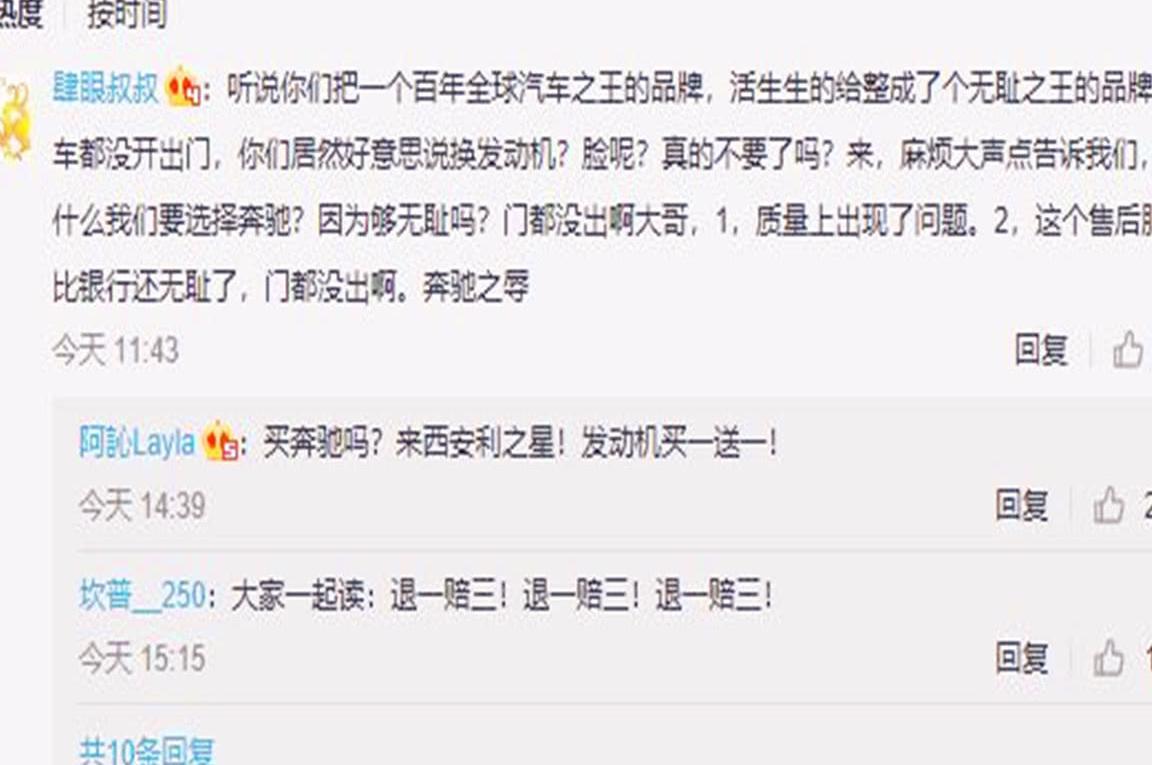 女高管提到根据三包的规定,如果发动机出现了问题只能更换发动机,而奔驰放也是出于对女研究生的同情,愿意退车,看起来就感觉奔驰还是比较人性化的,毕竟按照规定你只能换发动机,,但是我给你换车了。然而女研究生却说,根据国家三包的规定,如果修车时间超过5天,4S店必须为客户提供一辆代步车,供临时使用,然而自己申请了四次,4S店却不闻不问,国家的三包是你们的三包吗?对你们有利的就是三包,对你们无利的,你们就不提,这是不是断章取义的做法?感觉女研究生好霸气,这个锅三包真的不能背。