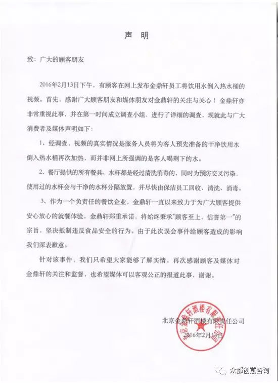 尽管事后再三解释、承诺,也只能让人感觉越描越黑,难以挽回金鼎轩品牌形象的损害。
