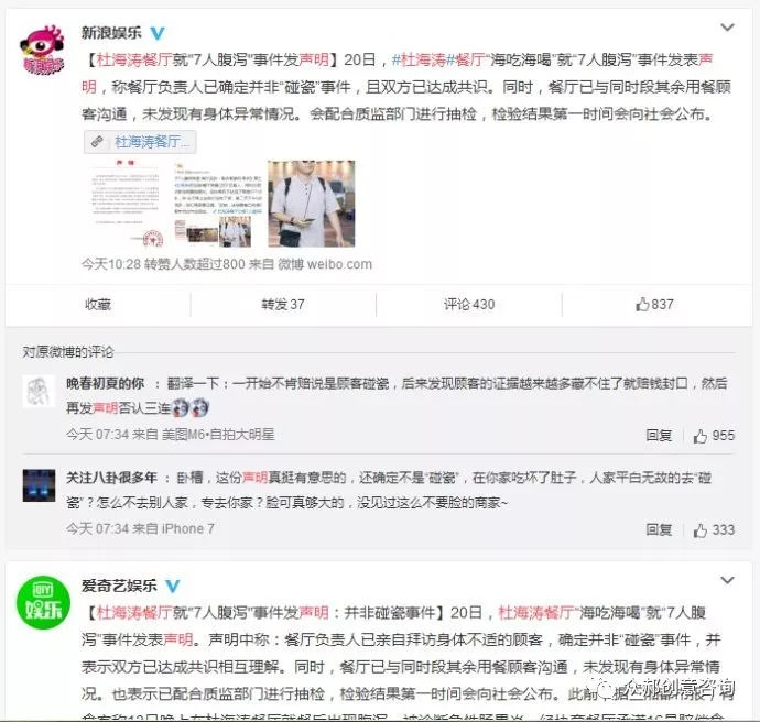 但后续因餐厅负责人的回复不当以及后续的两次推脱,导致食客将事件曝光至微博@杜海涛直接引起舆论的哗然,公众质疑和声讨,后续舆论自由发酵导致杜海涛餐厅及杜海涛本人声誉严重受损。