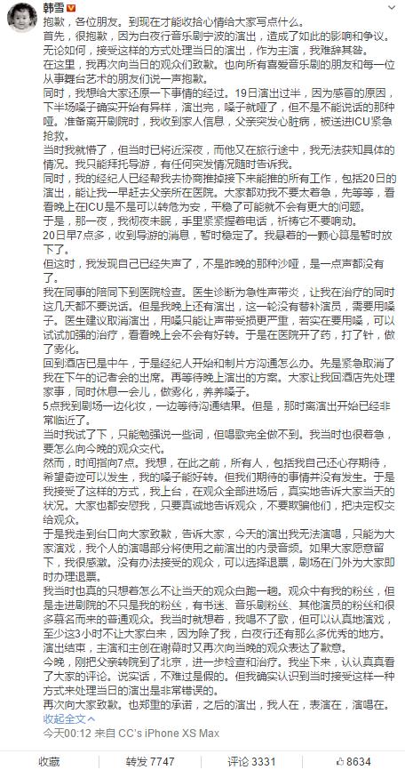 4月23日凌晨,韩雪自己终于在微博发表长文解释了,说19日演出完,嗓子就哑了。随后收到家人信息,父亲突发心脏病,被送进ICU紧急抢救。经历一夜未眠后,20日失声,才无奈走到台口向大家致歉,并告知演出无法演唱。最后再次向大家致歉,并承诺之后的演出,人在,表演在,演唱在。
