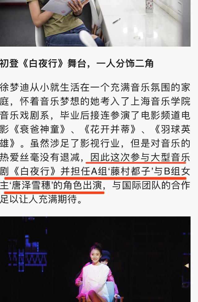 事件爆发后,网络上出现最多的疑问是:“A角突发失声,为何不用B角?”之前担任唐泽雪穗B角的,是一位叫徐梦迪的音乐剧演员。去年演出时,徐梦迪是作为女配角藤村都子A角登台演出。在演配角的同时兼任女主角的B角,但今年她的名字直接从名单中消失了。