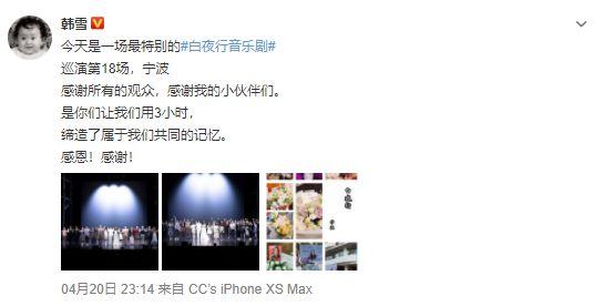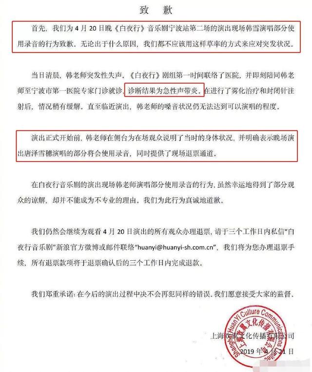 这里回放几个关键点:一是韩雪在19日晚演出前夜突发急性声带炎导致发声困难, 4月20日,音乐剧《白夜行》宁波场,主办方在开场时——而不是开场前将此情况告知观众并现场道歉,承诺可以退票。
