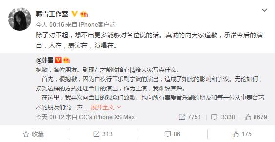 我们看看韩雪是怎么解释在演出中播放演唱部分录音的,“当时也真的只想着怎么不让当天的观众白跑一趟。我当时就想着,我唱不了歌,但可以认真地演戏,至少这3小时不让大家白来。我确实认识到当时接受这样一种方式来处理当日的演出是非常错误的。”