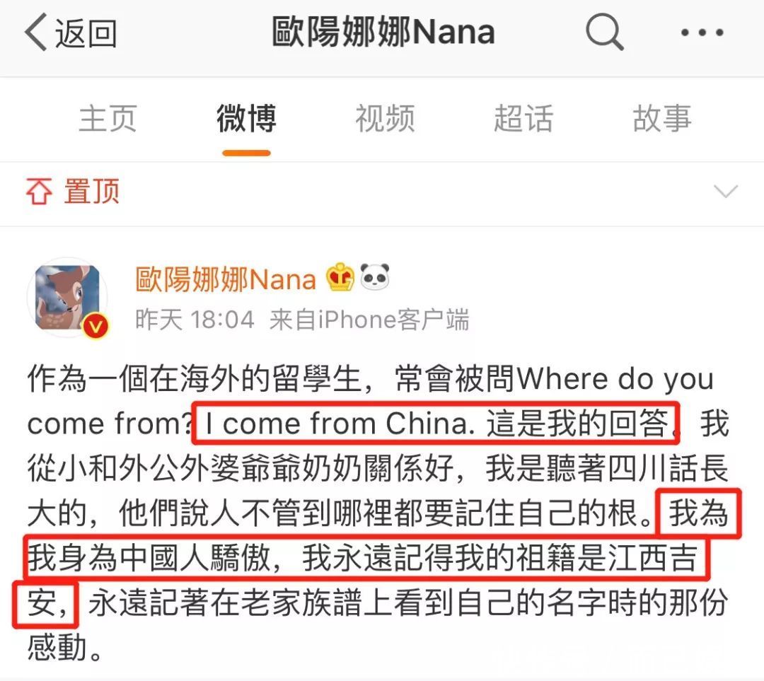 她自己也转发,特意强调自己祖籍江西,始终为自己是中国人而骄傲,没有忘本。