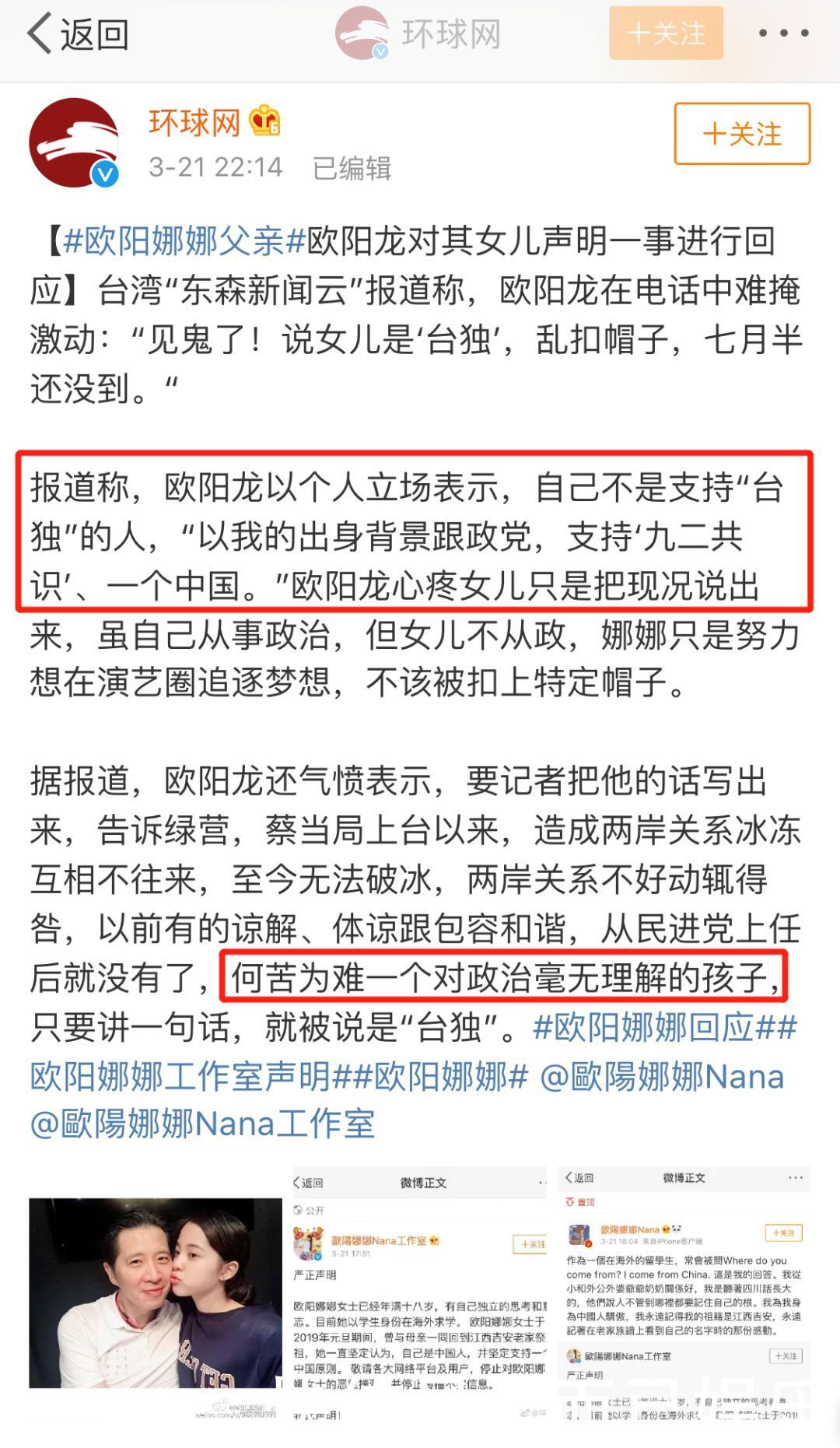 因为与此同时,她爸欧阳龙发声回应,气愤表示这些人在为难他女儿,还说自己始终支持一个中国,