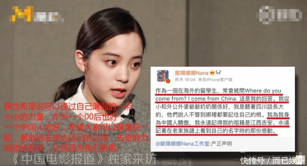 昨天傍晚,欧阳娜娜接受中国电影报道的独家专访,正面亲身出镜回应,表示不管出生在哪里,她都是中国人,