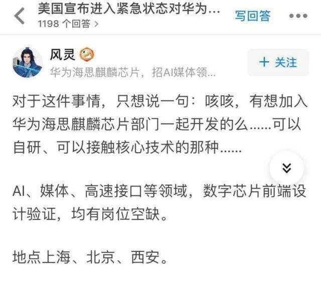 在知乎相关问答下,被顶上了首位的是一位认证为“华为海思麒麟芯片”的相关人士的发布的非官方招聘启事,评论区满满都是鼓励与感动。