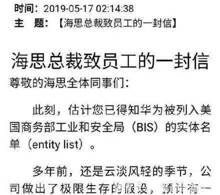 这封刷屏的内部信于5月17日凌晨2点14分发出,信中称,公司曾经做出了极限生存的假设,总有一天所有美国的先进芯片和技术将不可获得,而华为为了这个以为永远不会发生的假设为公司生存打造了很多“备胎”。