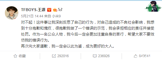 随着事件波及层面越来越高,很多无辜的人被带入话题,为了遏制事件的不断发酵,王源通过其社交账号公开发文致歉,表示将接受处罚认真反省。本以为王源在道歉之后这件事就会慢慢过去,随后网上又不断出现了王源道歉缺乏诚意的话题,认为是他没有真正意识到错误,套用了“万能模板”,致歉的内容去年“翻栏杆”的时候就曾经用过。