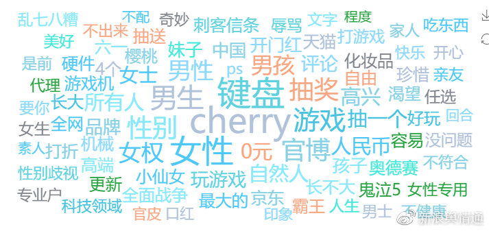 关键词云中,“CHERRY”“键盘”“抽奖”是事件爆发的导火索;“女性”“男性”“女权”“性别歧视”等词表示性别平等是话题争议焦点;“官博”“不配”“辱骂”等有关CHERRY官博的言论和态度引发舆论评价及关注。